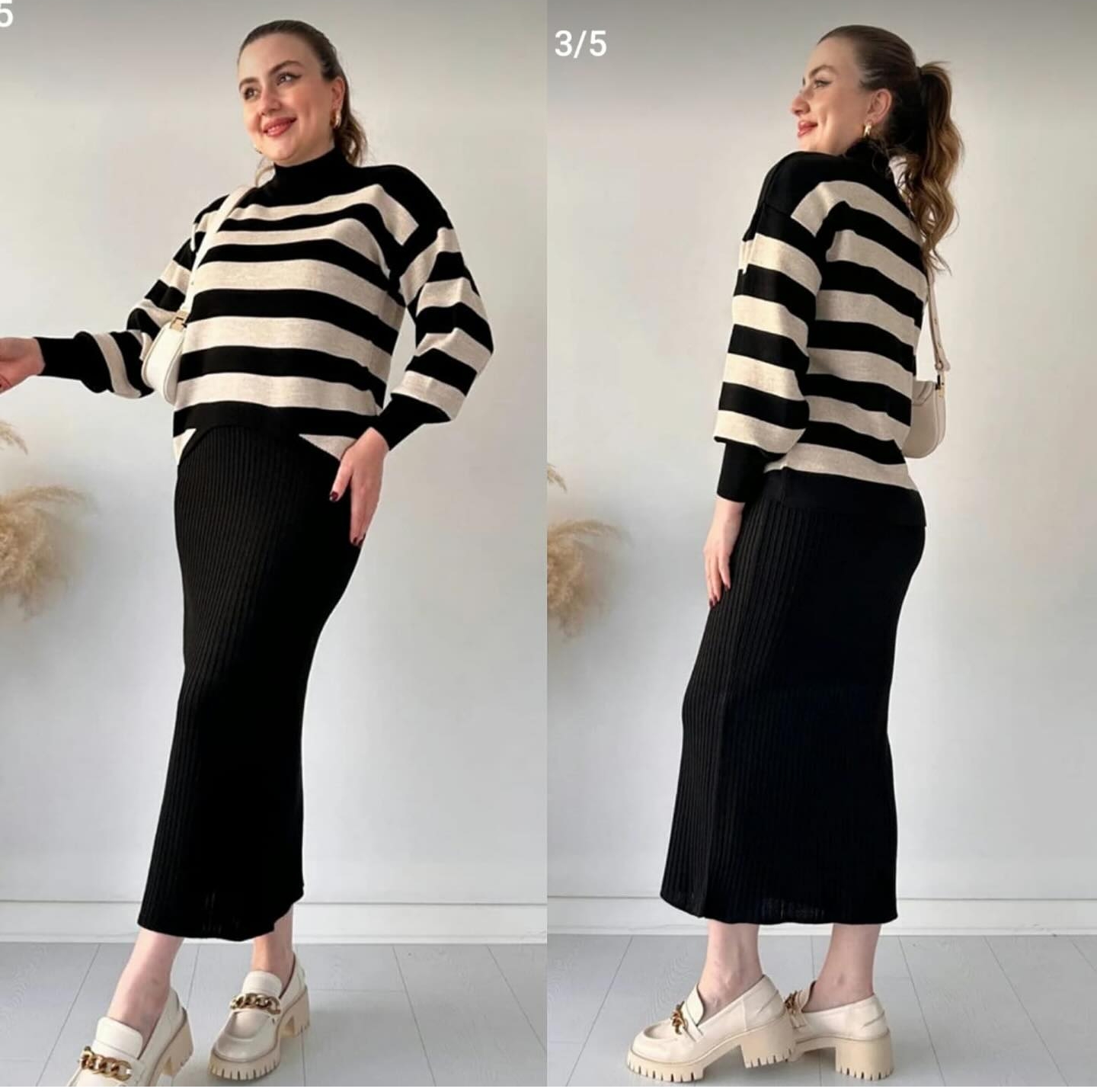 Dik Yaka Kalın Çizgili Jileli Triko Elbise