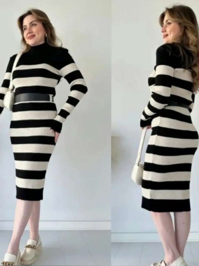 Triko Elbise Çizgili Kemerli